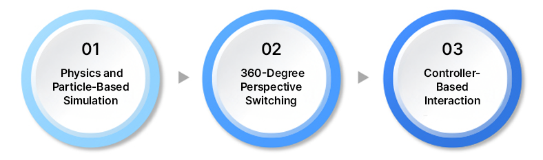 01. Physics and Particle-Based Simulation: To realistically reproduce physical phenomena such as ignition, spread, and explosion—key hazards in alcohol lamp accidents—physics-based simulation technology and particle systems are utilized together. The evaporation of alcohol, the resulting flammable vapor, and the spread of flames are meticulously implemented, reflecting flame speed, range, and surrounding gas reactivity to simulate responses close to real accident scenarios.