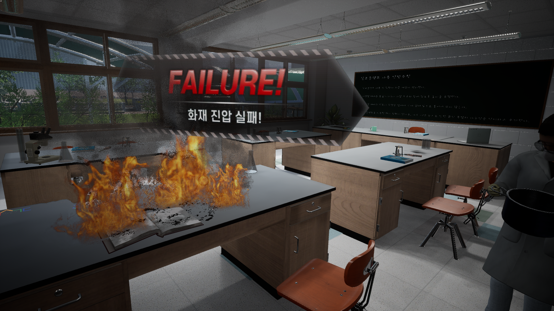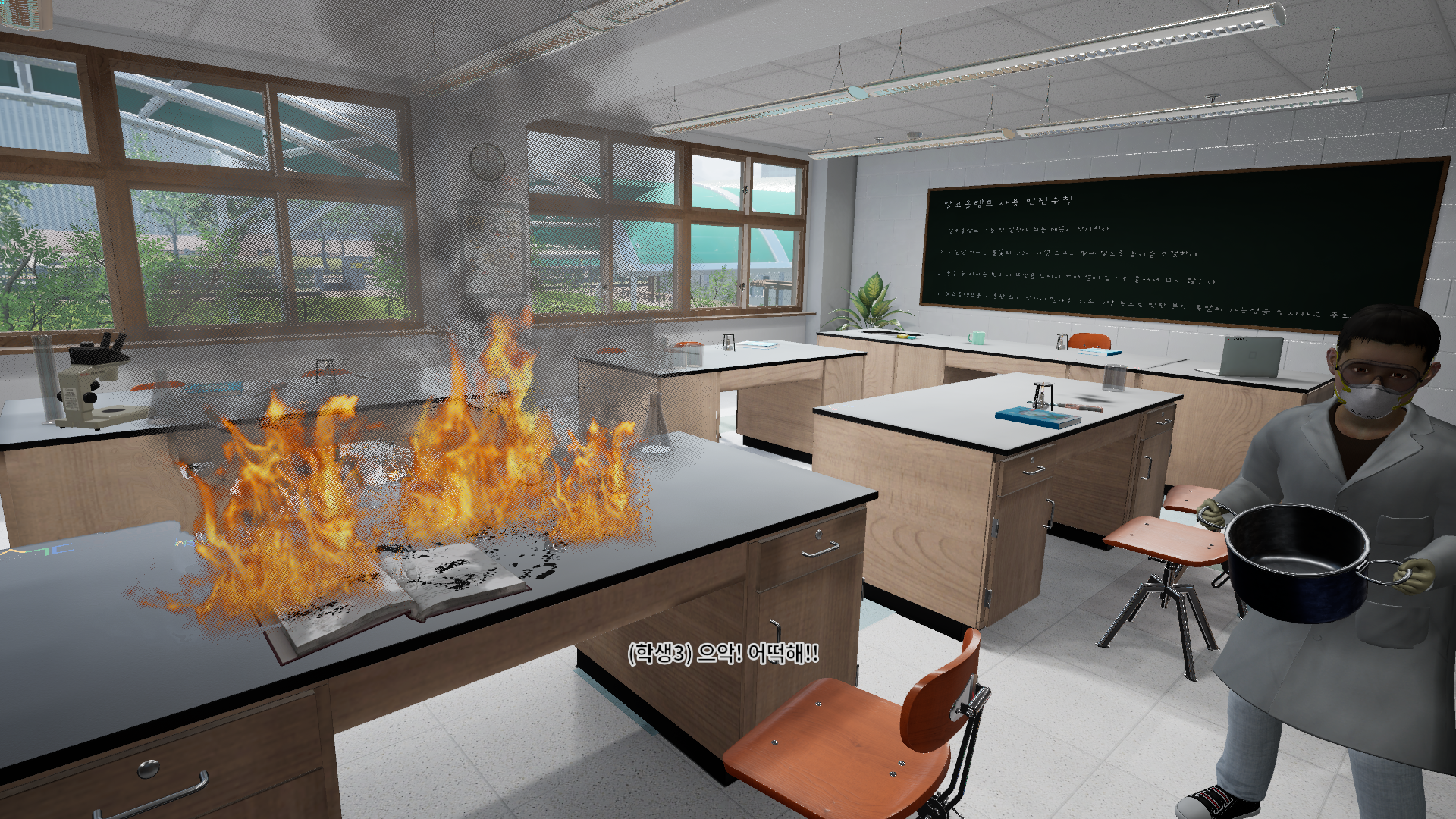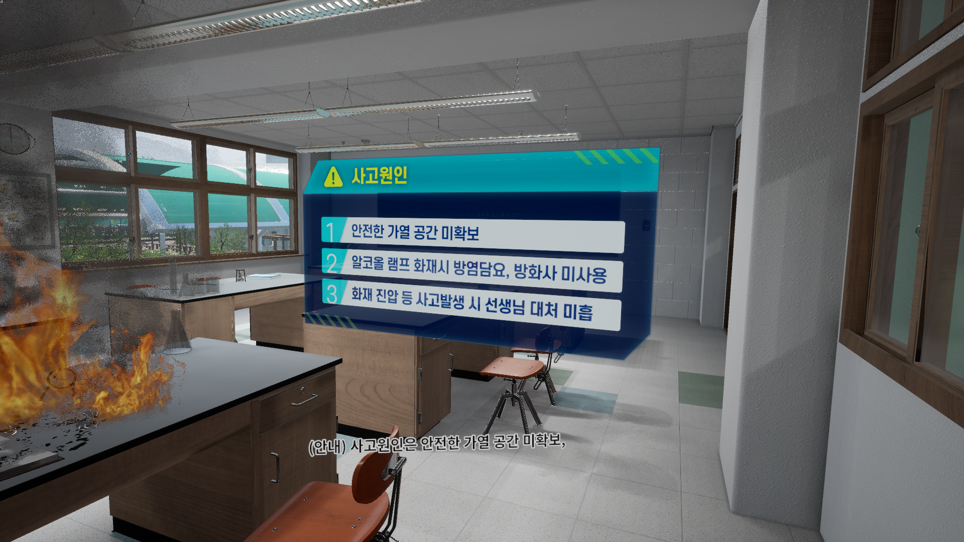 "Immersive VR content that allows users to experience fire situations that may occur during alcohol lamp experiments, learning safety protocols such as ignition methods, evacuation procedures, and prevention steps in a step-by-step manner"