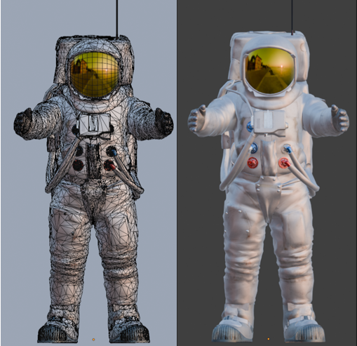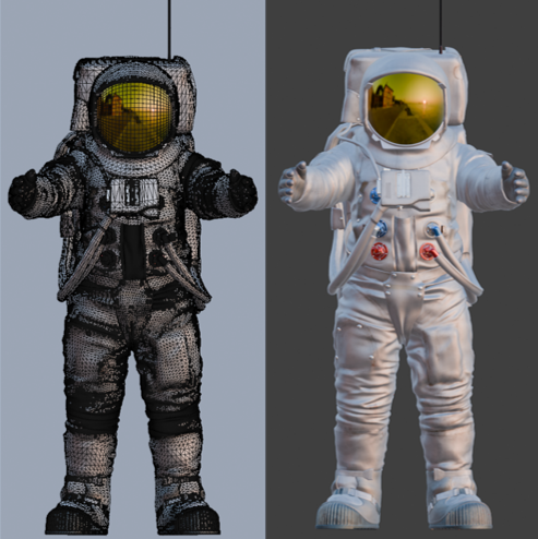 02. High-Quality Modeling: To maximize realism and immersion, high-polygon modeling is used to increase precision. We also employ PBR (Physically Based Rendering) texturing to realistically represent reflectance and surface properties of various materials such as metal, glass, and fabric, and we utilize subdivision modeling and digital sculpting to craft fine surface details. This achieves film-level visual quality across the lunar-exploration environment, creating objects that look lifelike. Through these objects, photorealism (making objects look real) gives the sensation of truly being in space.