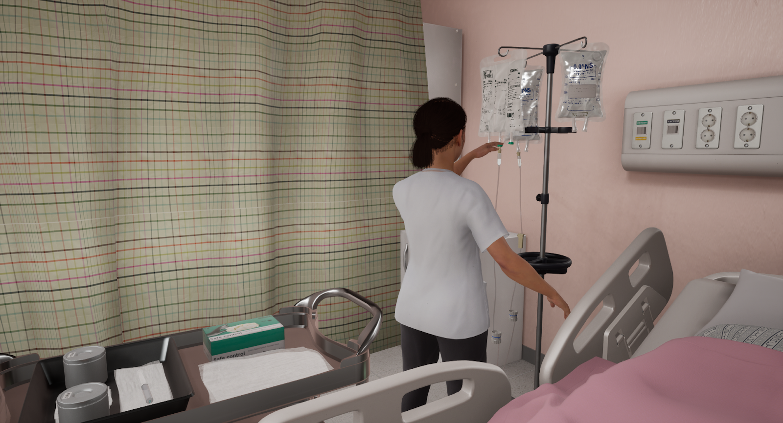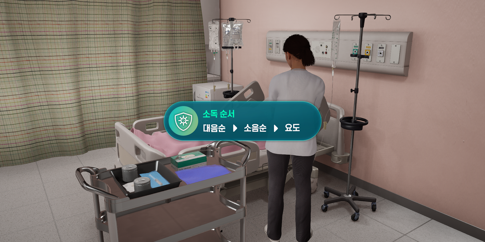 01. Highly Immersive Virtual Environment: By reproducing realistic spaces—nurses’ station, preparation room, and patient ward—based on actual hospital layouts, learners can experience the process from a nurse’s perspective with high immersion.