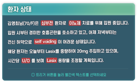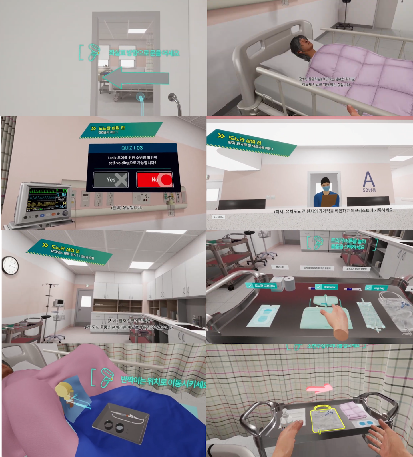 In this VR content, the learner acts as a nurse, conducting an initial interview to assess the patient's condition, selecting and preparing the required items, and then performing catheter insertion and maintenance according to proper procedure. During the process, knowledge checks via quizzes are incorporated so theory and practice are learned together. After the procedure, learners also experience patient education for infection prevention and documentation, improving problem-solving, infection prevention skills, and nursing judgment required in actual clinical situations.