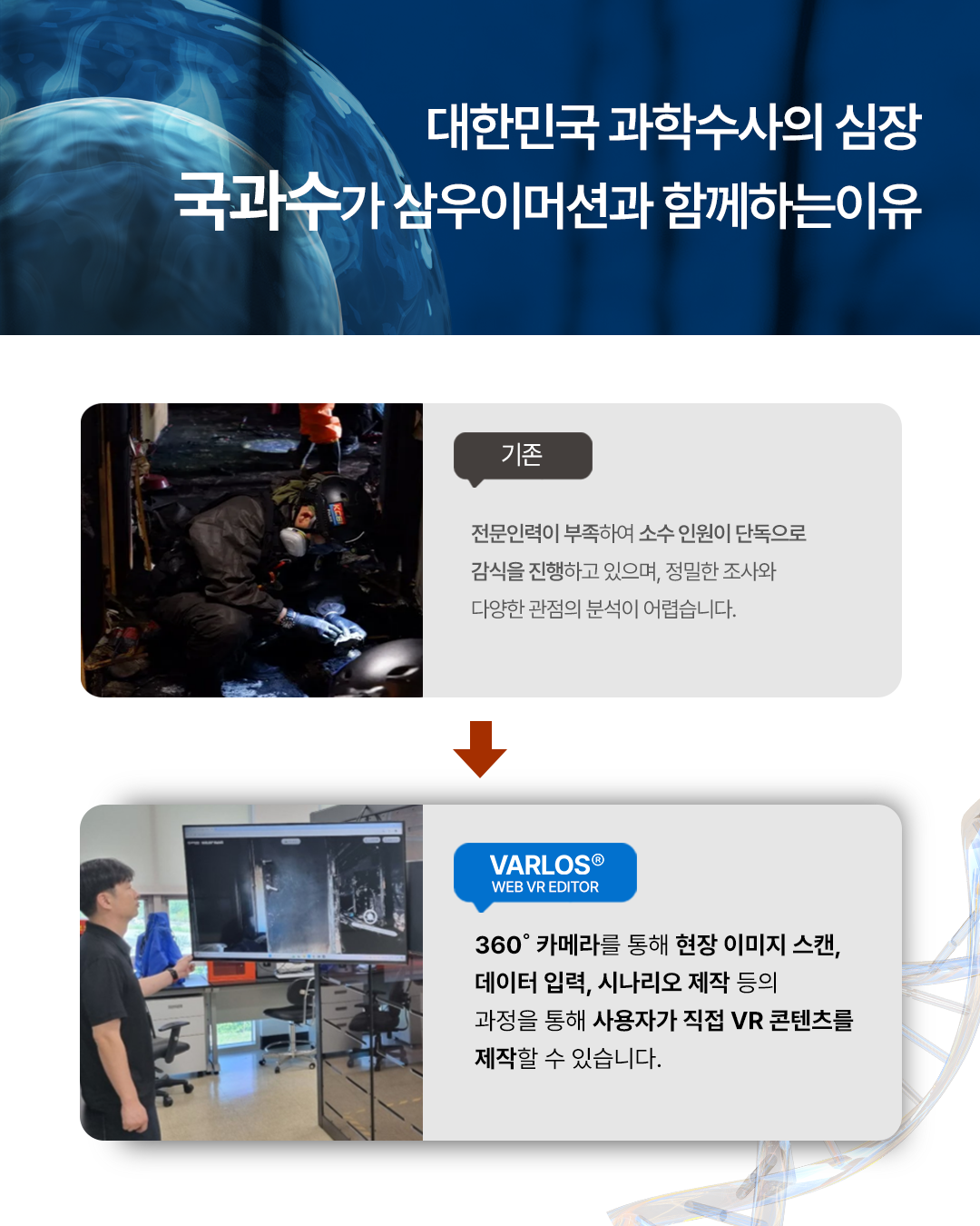 Existing forensic science education faces limitations in accurately recreating real crime scenes, and high-risk training has limitations in repetitive practice. Furthermore, investigators can only indirectly experience various types of field situations. At this juncture, Samwoo Immersion uses XR technology to build virtual realities that are identical to or more complex and diverse than reality, providing an immersive and safe training environment for investigators through simulations.
