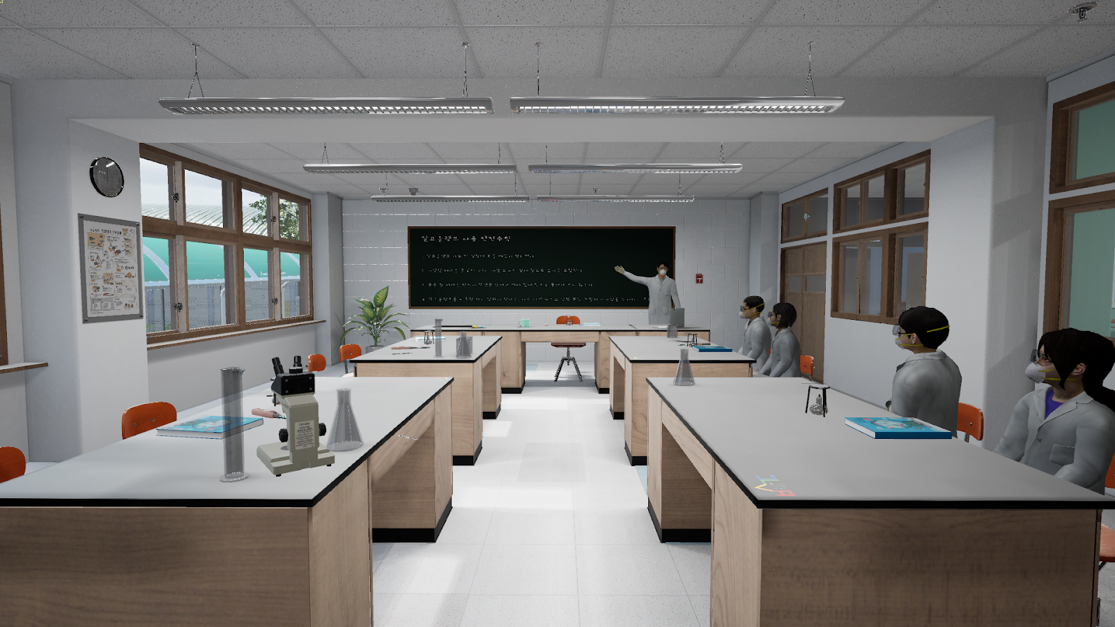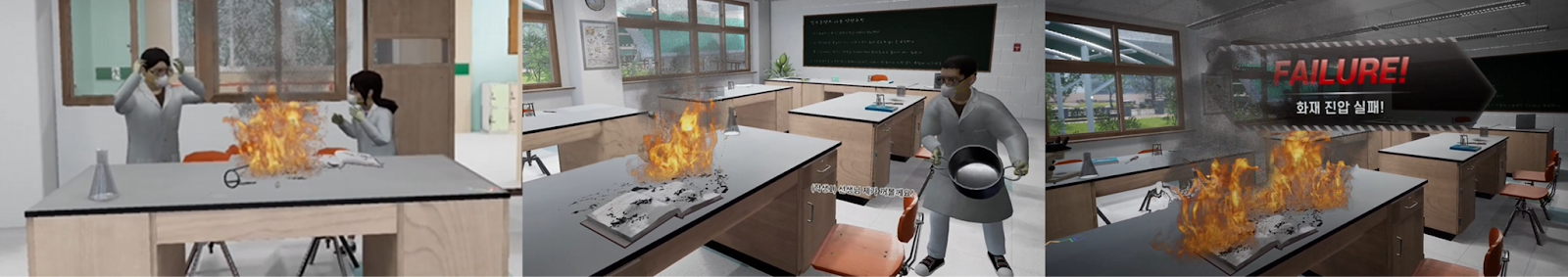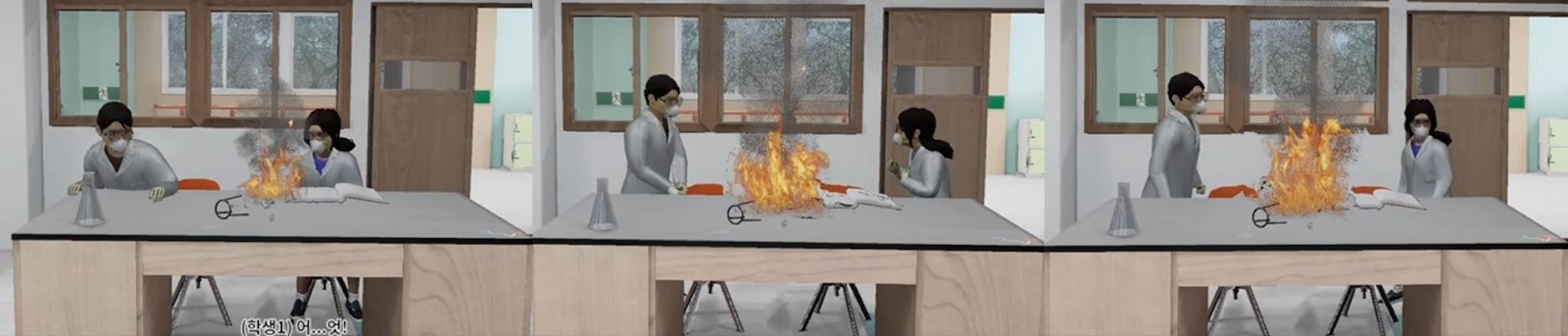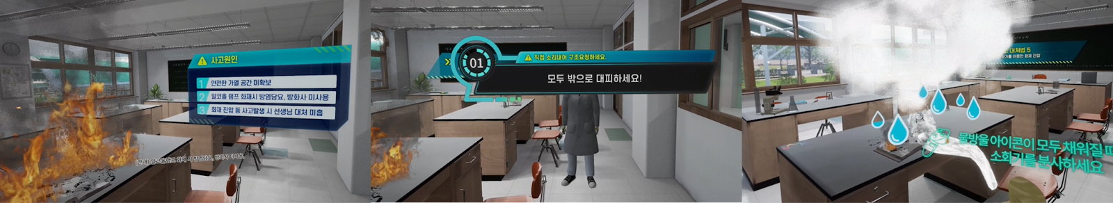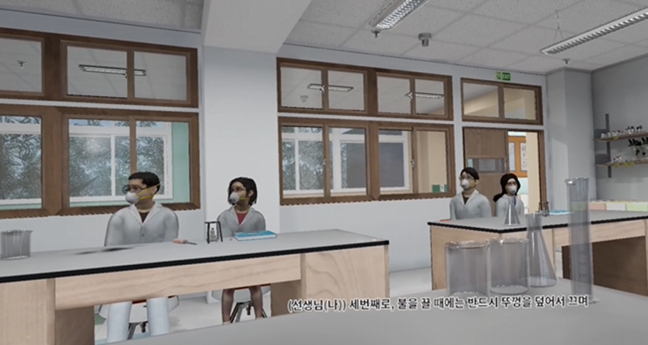 01. Realistic Practice Environment Implementation : Users can experience a situation as if they are actually participating in a class, where a teacher is giving a lesson and students are playing, leading to an alcohol lamp accident. The virtual environment is made more realistic by precisely implementing the actual scale of the lab and hallway, as well as the classroom's decorations and equipment