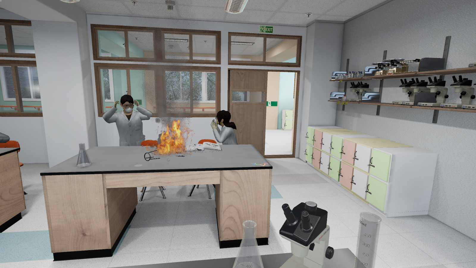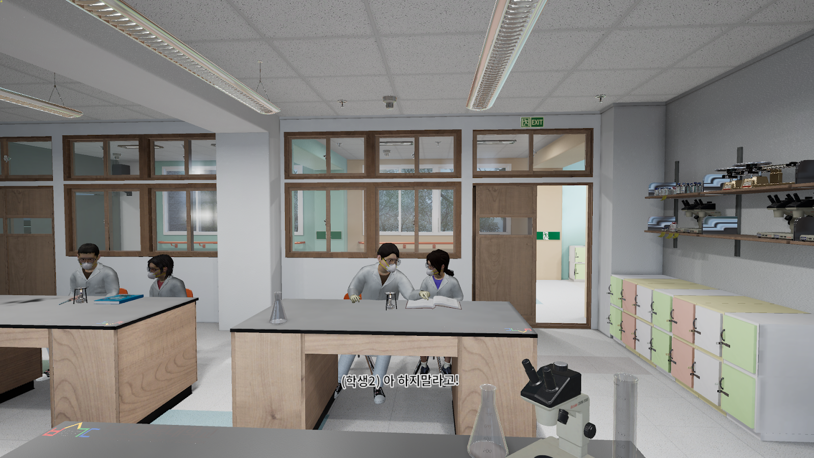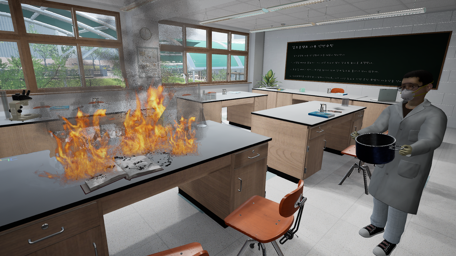 01. Realistic Practice Environment Implementation : Users can experience a situation as if they are actually participating in a class, where a teacher is giving a lesson and students are playing, leading to an alcohol lamp accident. The virtual environment is made more realistic by precisely implementing the actual scale of the lab and hallway, as well as the classroom's decorations and equipment