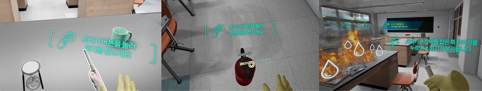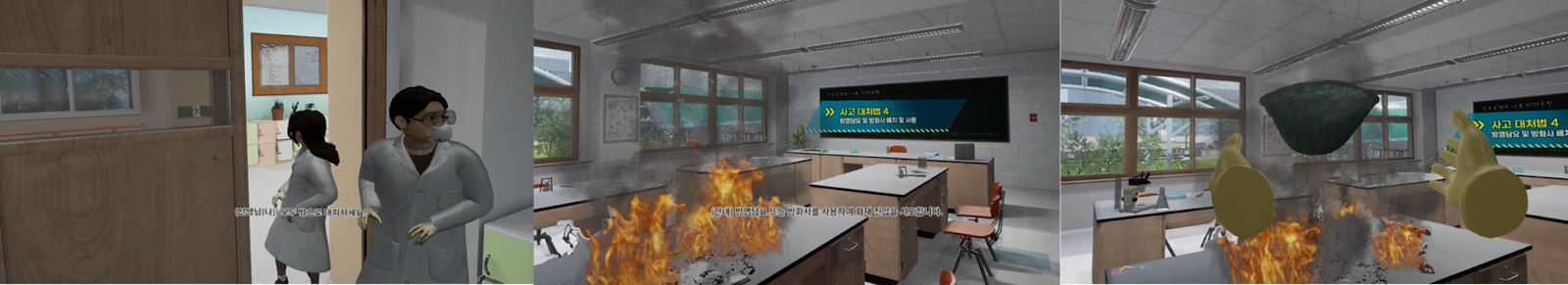 The experience is designed so that the user observes a class, witnesses a fire, learns about incorrect responses, and then directly experiences the correct preventative measures. Through the user interface (UI), users can give voice commands for help or put out the fire, with visual and auditory feedback that enhances both safety awareness and accident prevention skills.
