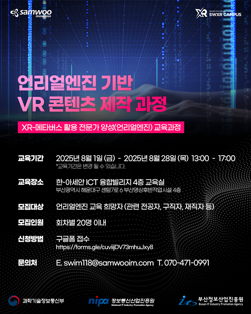 This course is part of the “XR-based Metaverse Professional Workforce Training” initiative led by the Ministry of Science and ICT and the National IT Industry Promotion Agency (NIPA). It is operated by SWXR Campus under the supervision of the Busan IT Industry Promotion Agency as a public-private collaborative program for professional talent development.