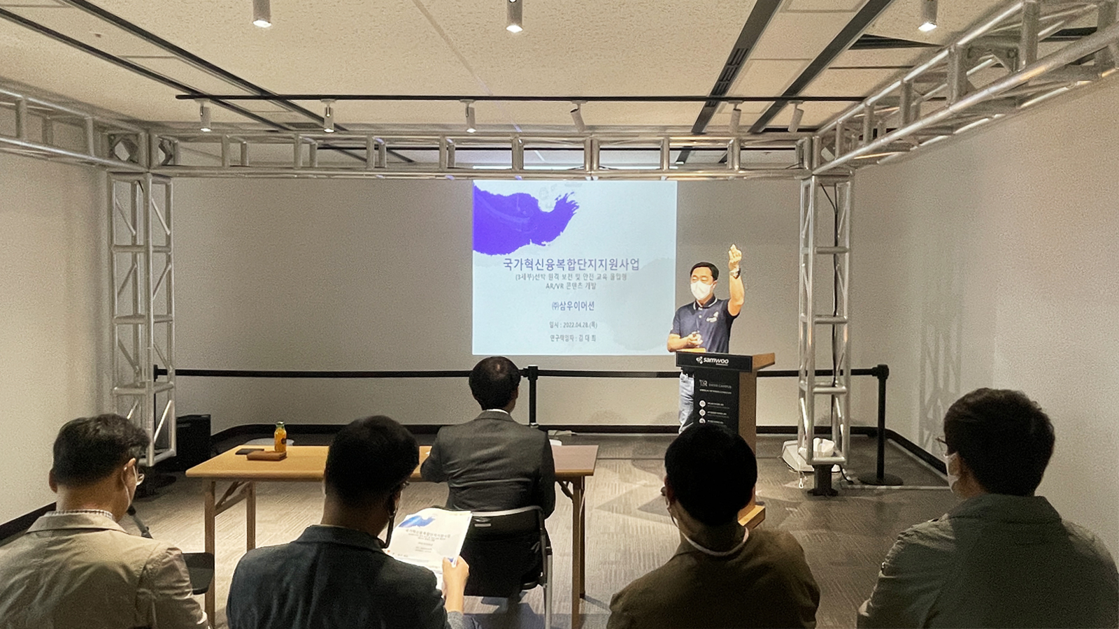 22.04.28. (Thu) Samwoo Immersion was specially selected to identify the beneficiary companies related to the national innovation cluster project promotion It was a time to share the SWXR™ CAMPUS operation vision to spread the current national innovation cluster business performance.